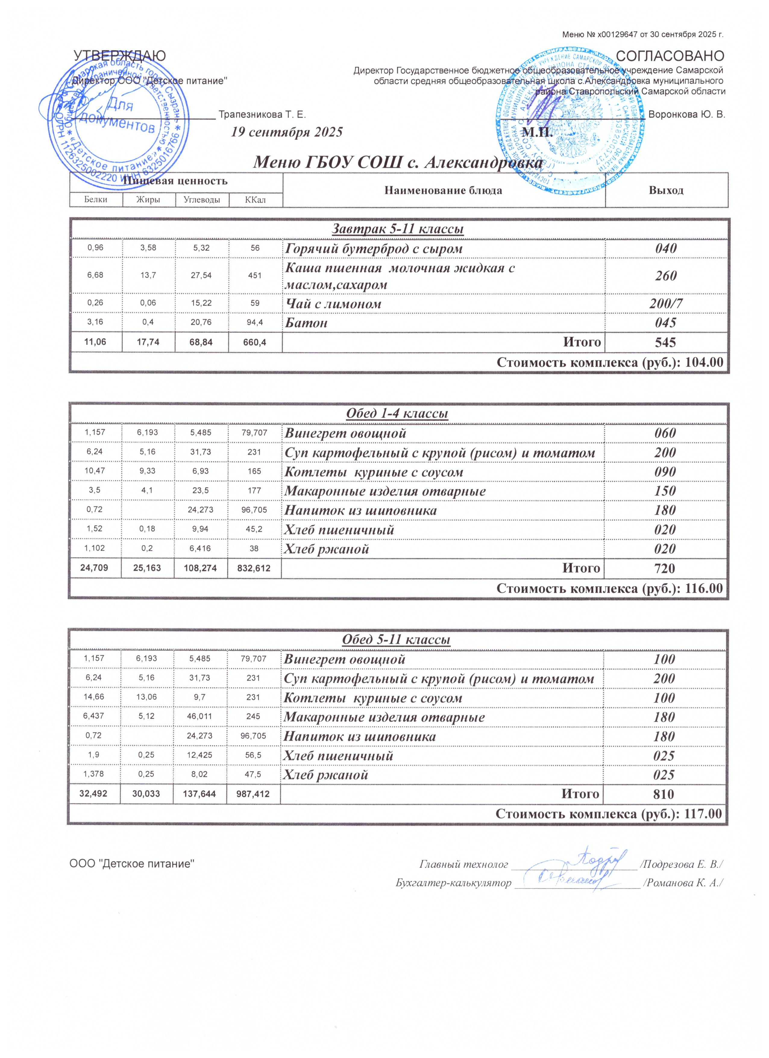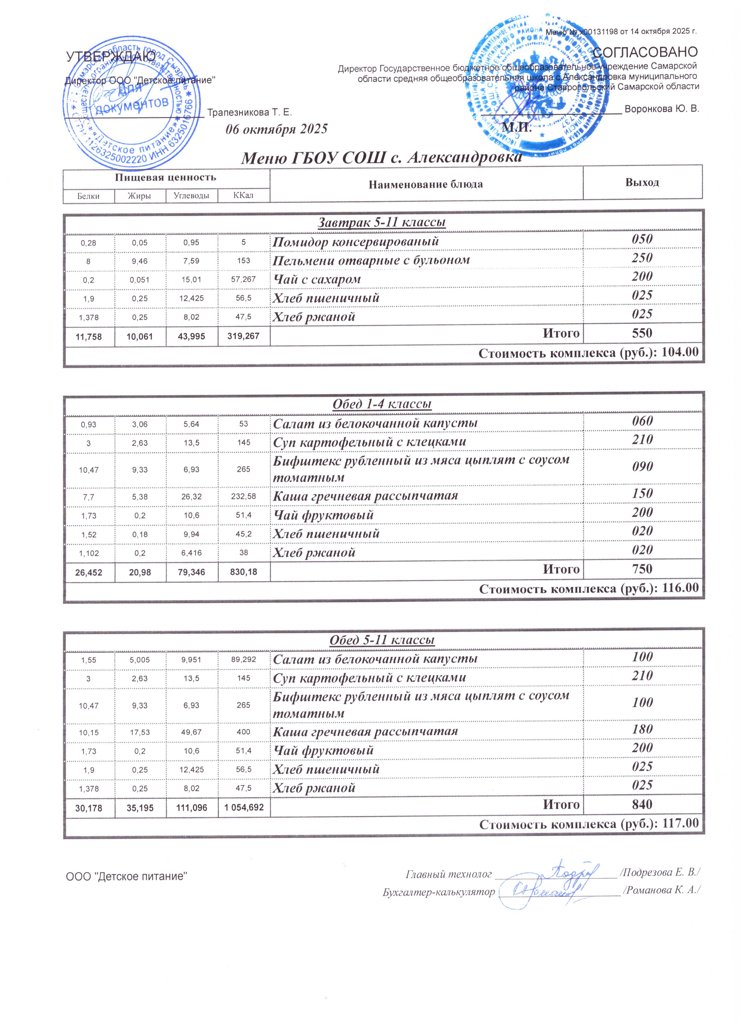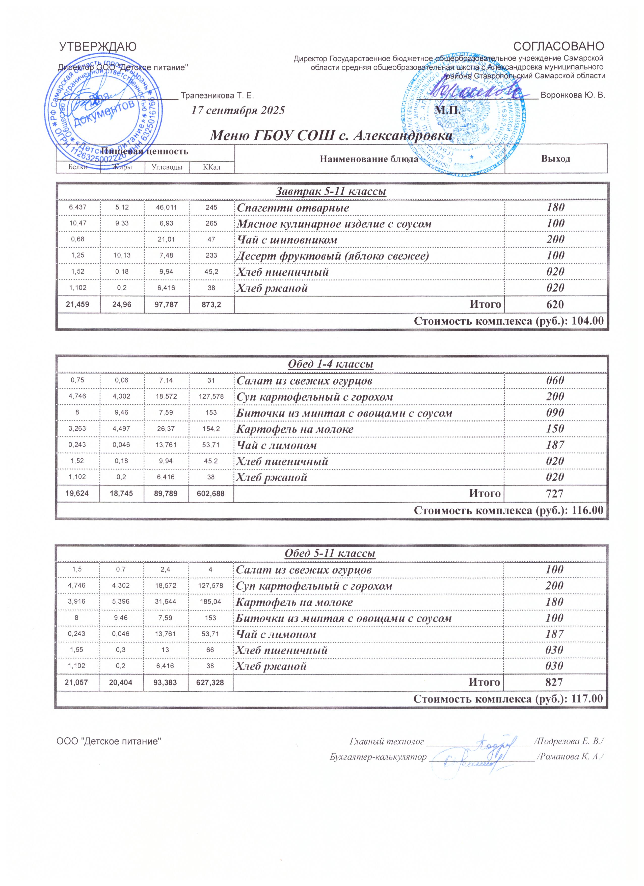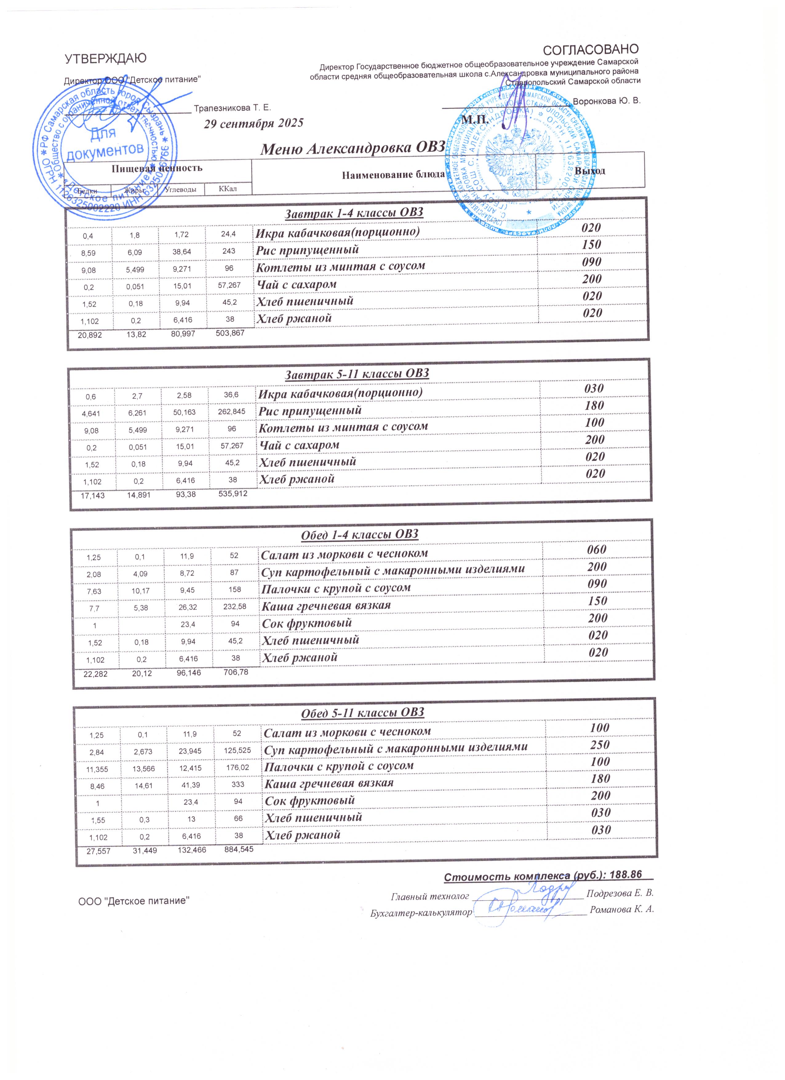 Ответственный за питание в ГБОУ СОШ с. Александровка Земляк Елена Павловна 8(8482)238150