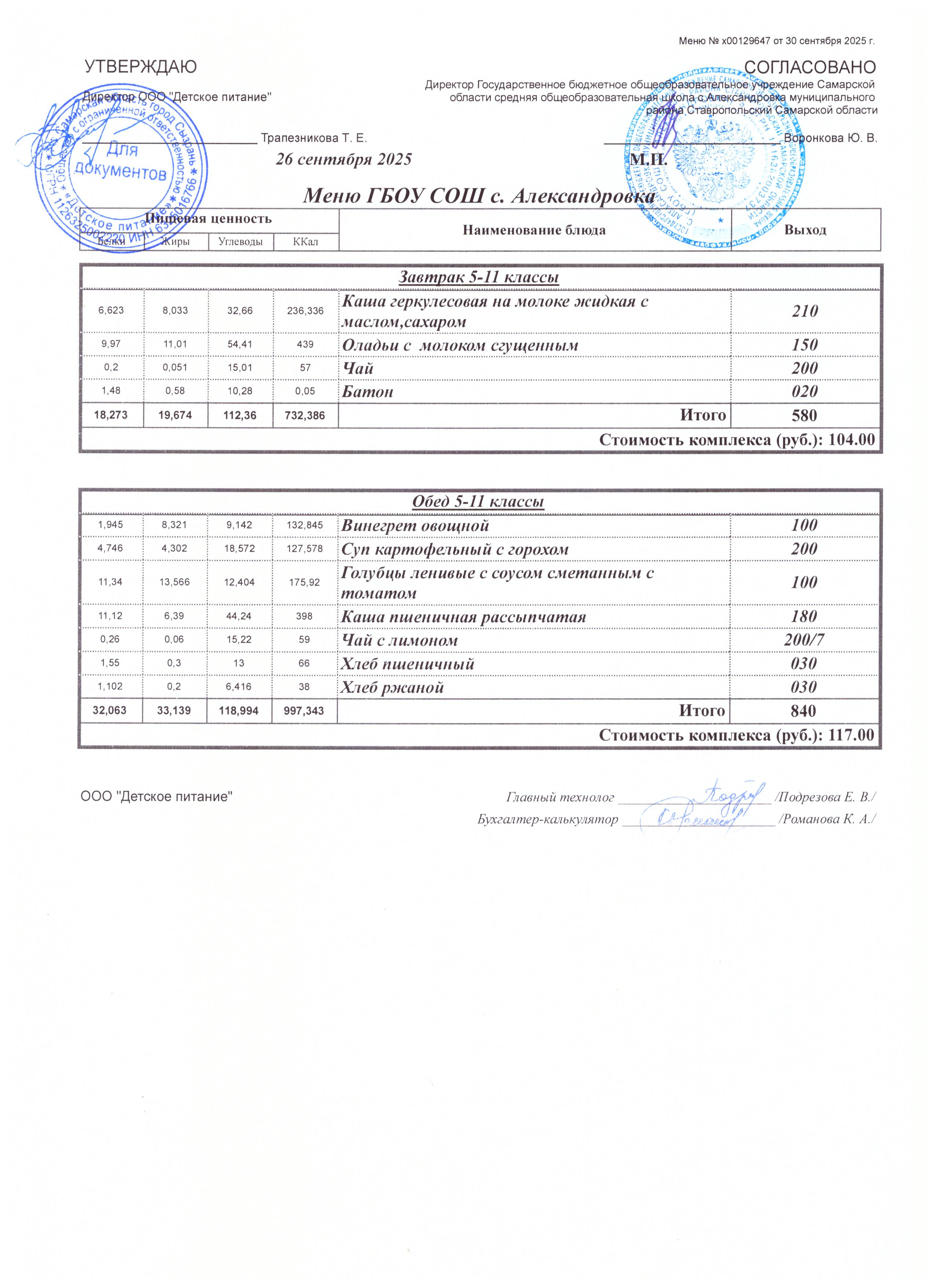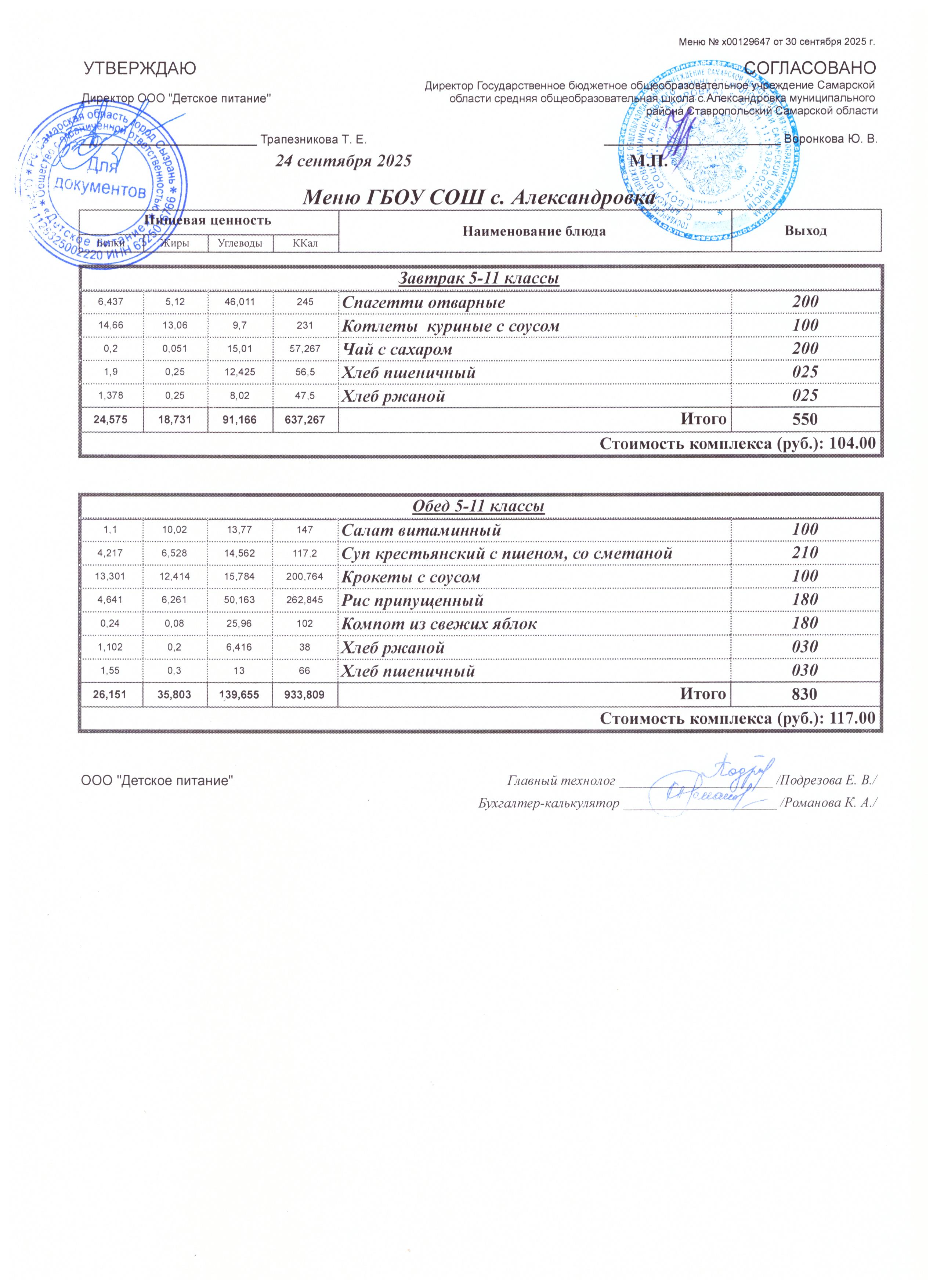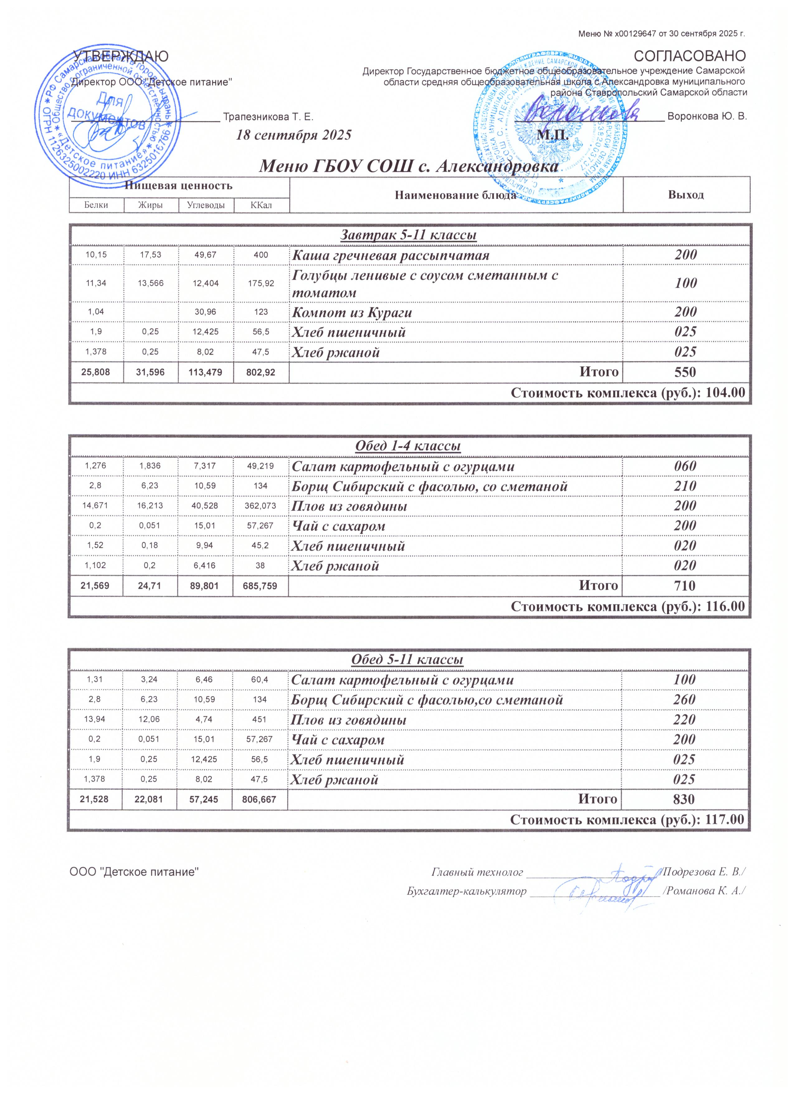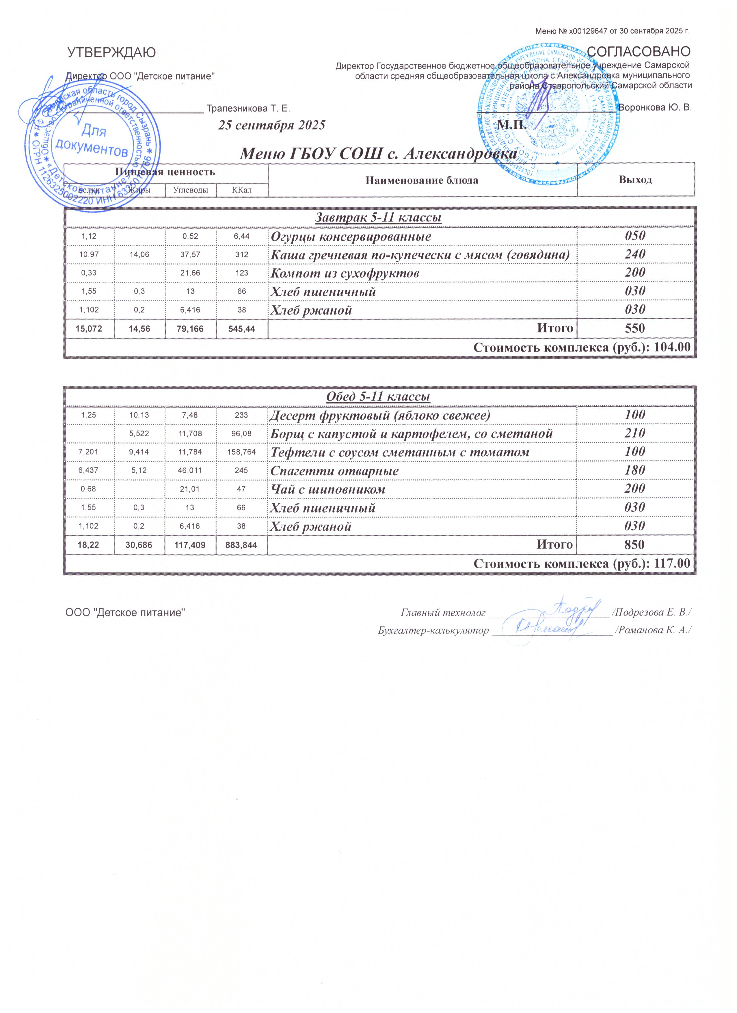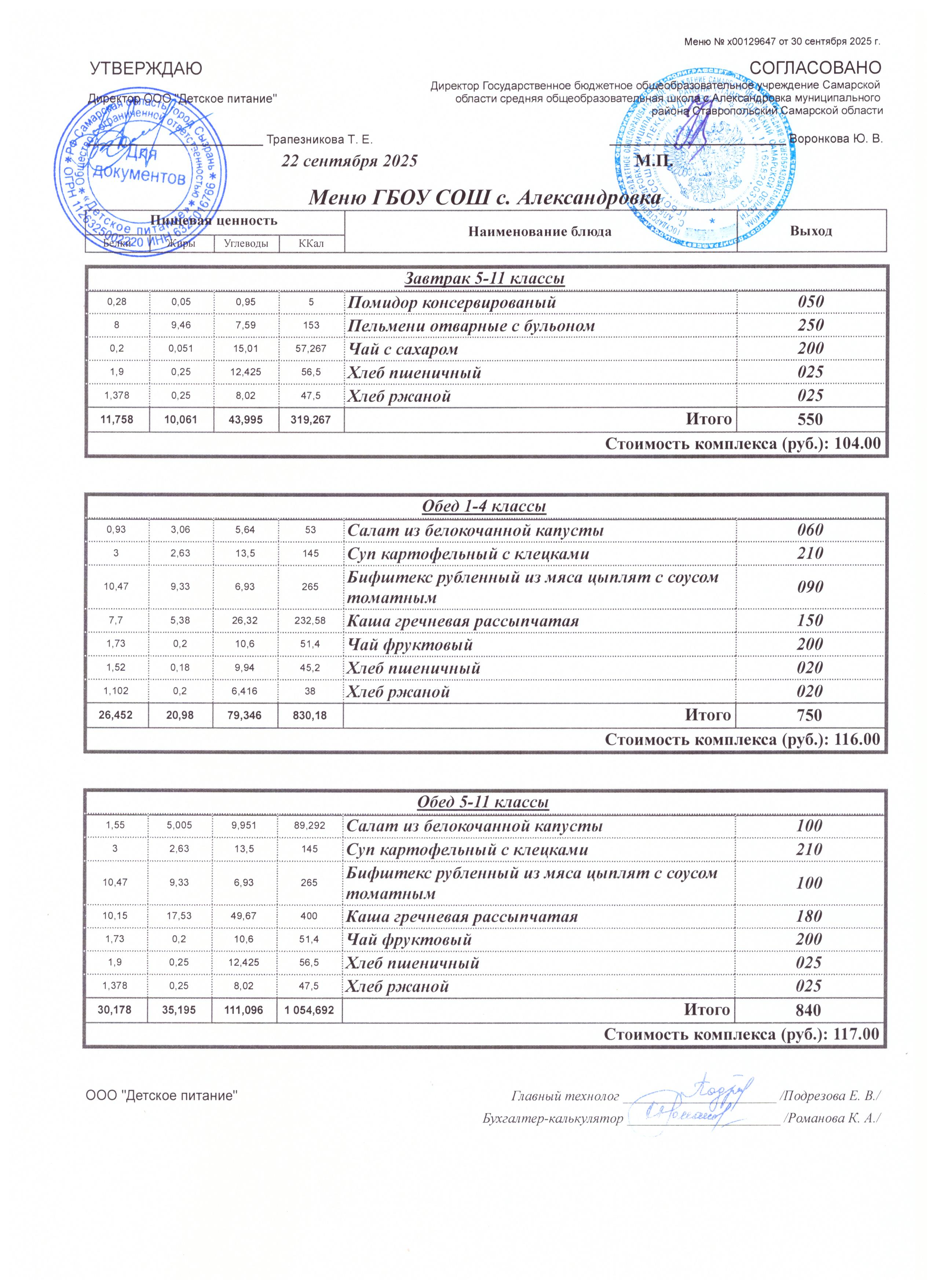 Ответственный за питание в ГБОУ СОШ с. Александровка Земляк Елена Павловна 8(8482)238150