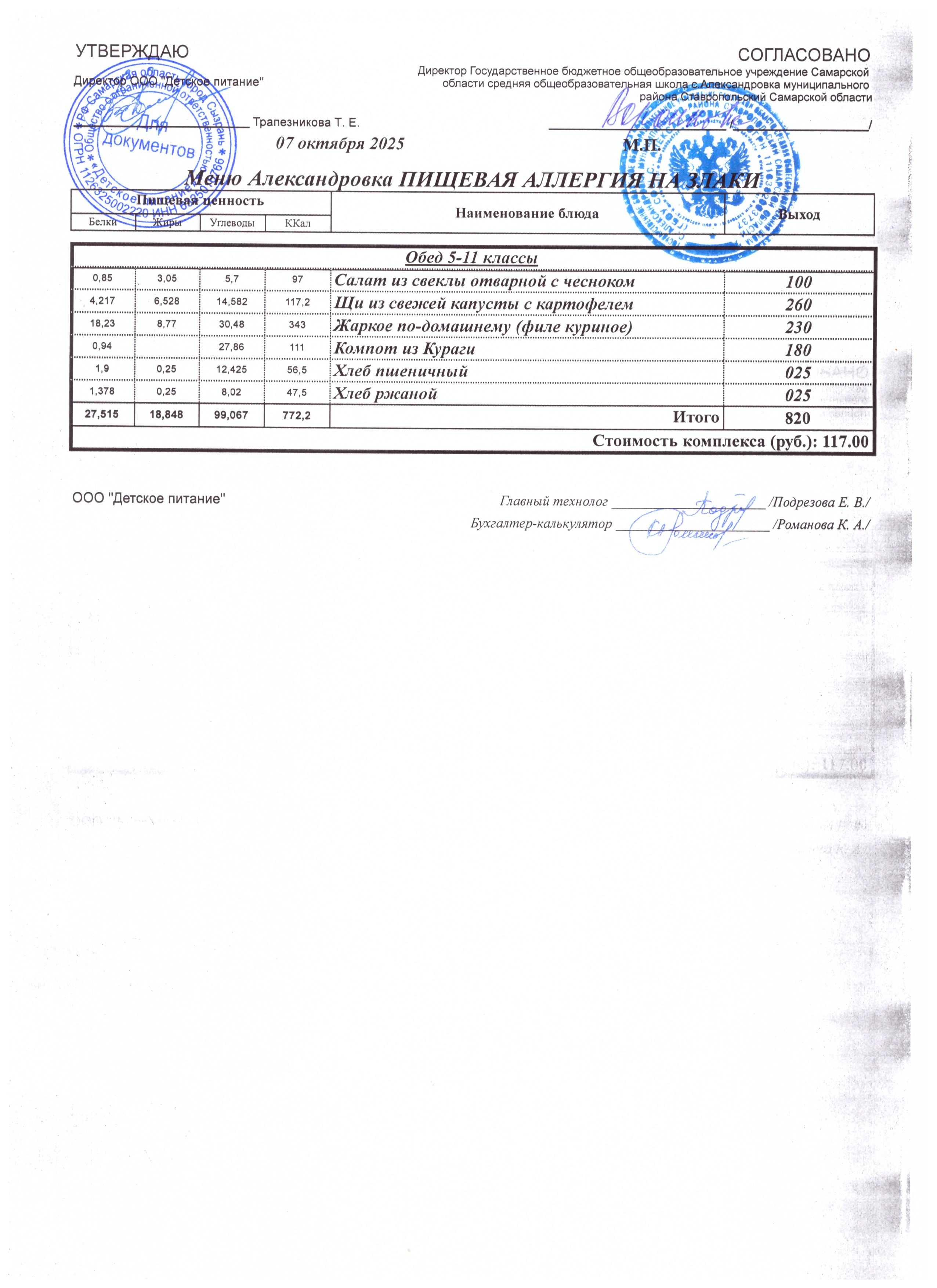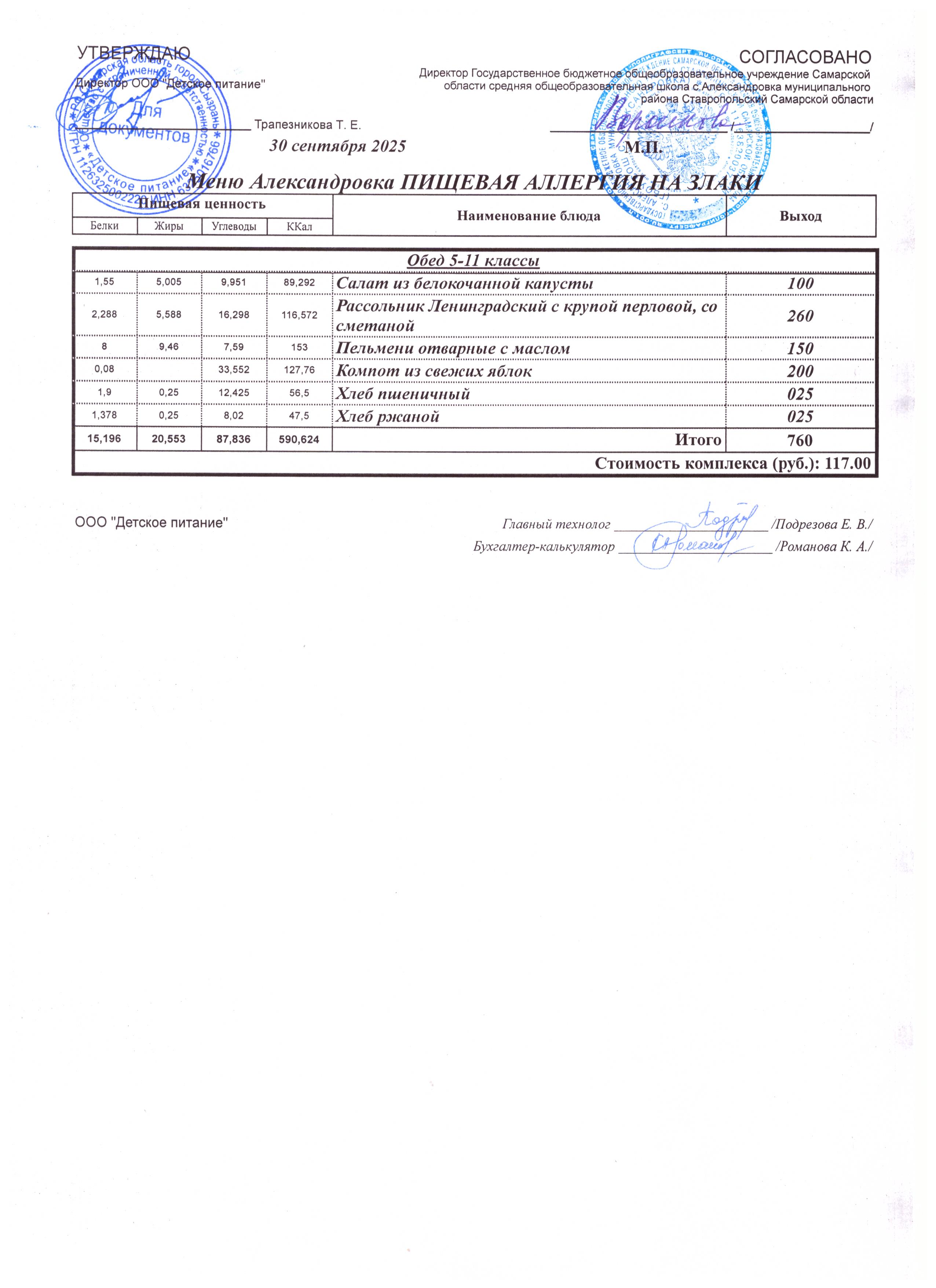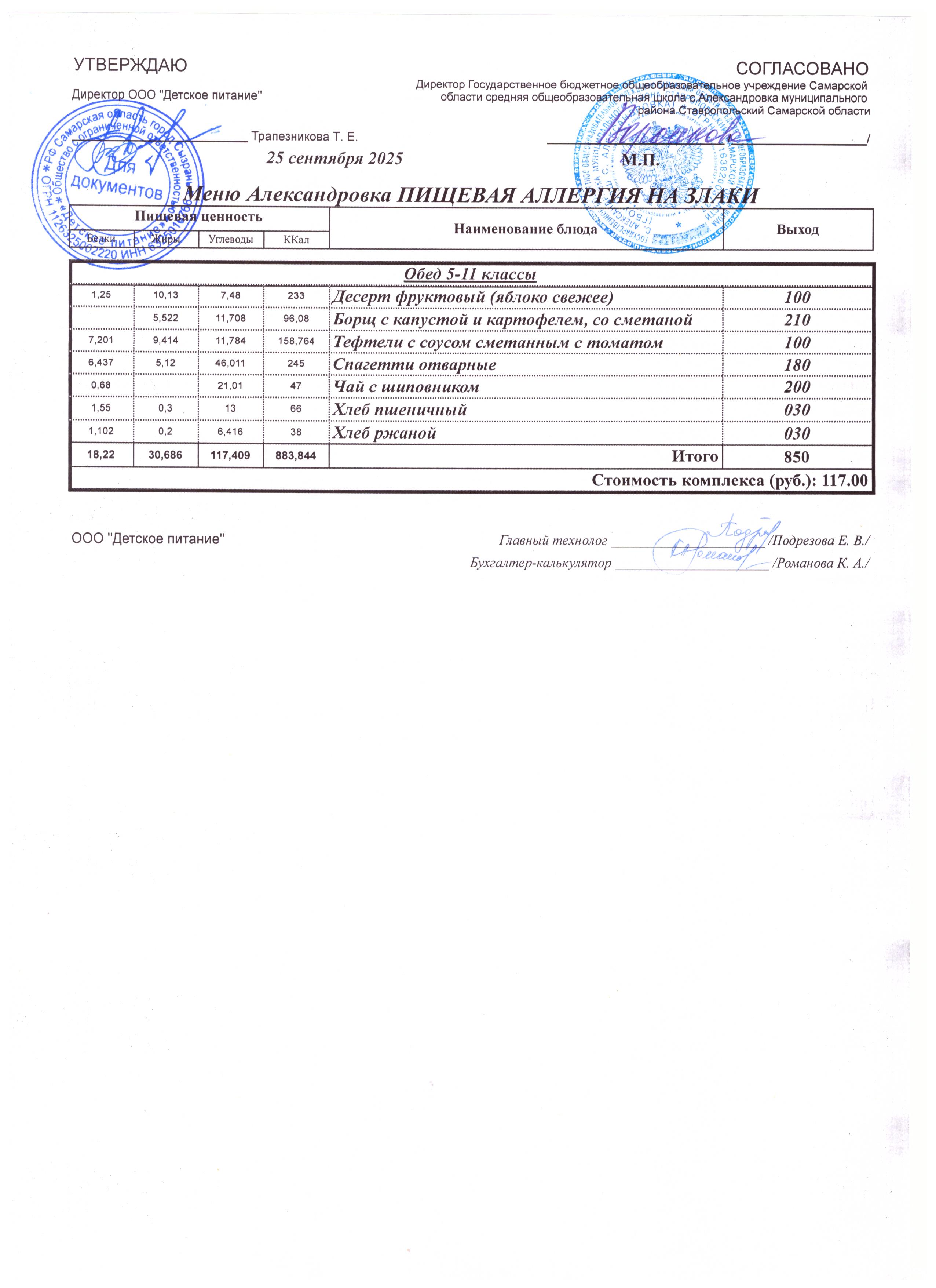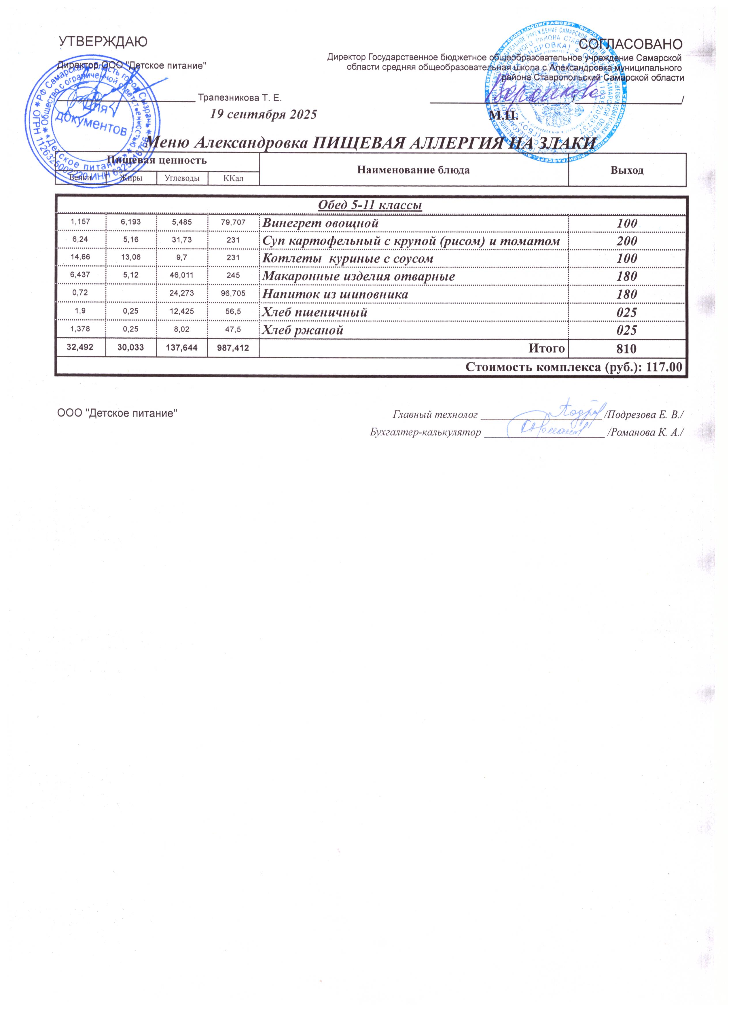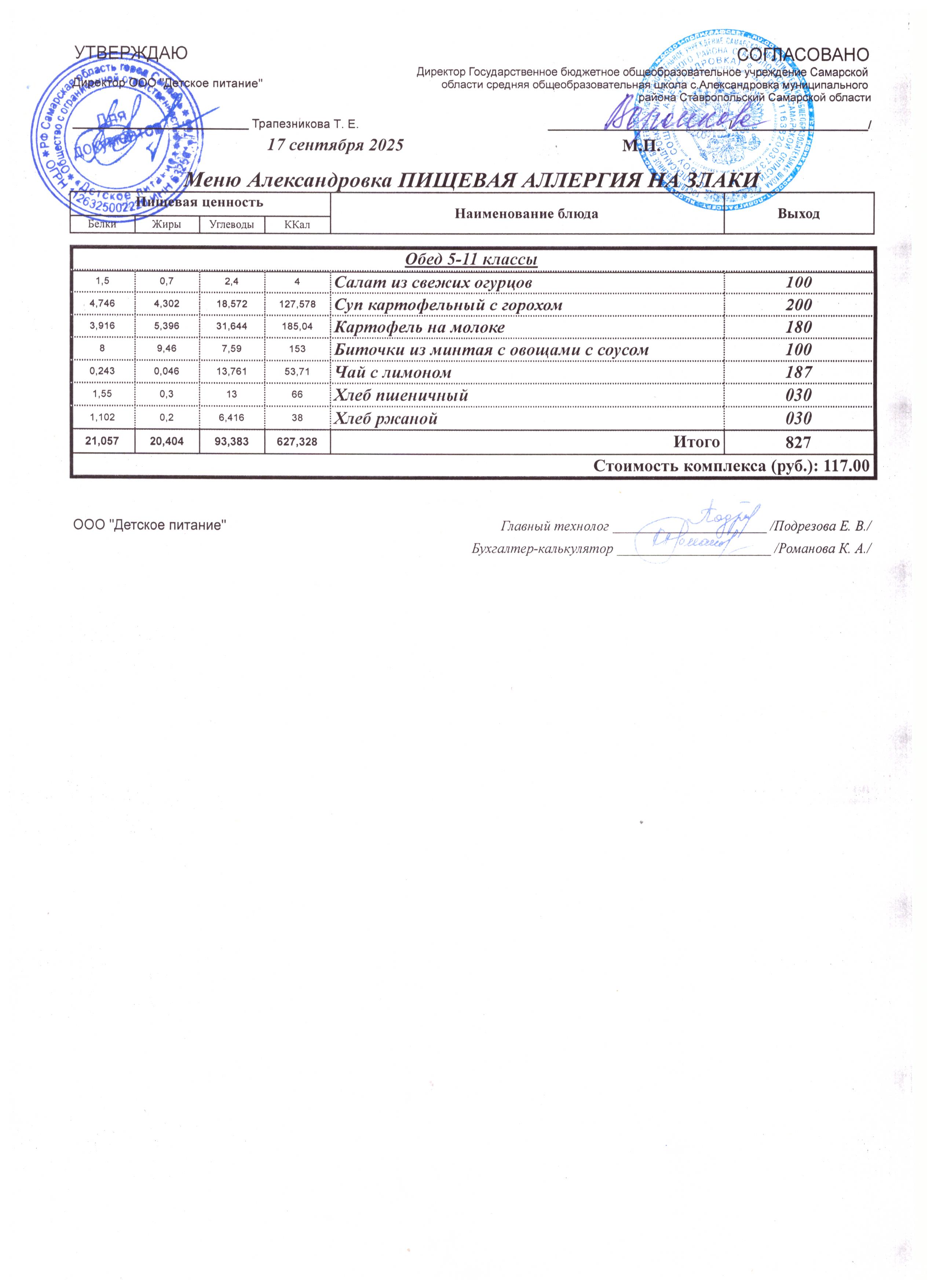 Ежедневное общее меню для учащихся с пищевой аллергией на злаковые: