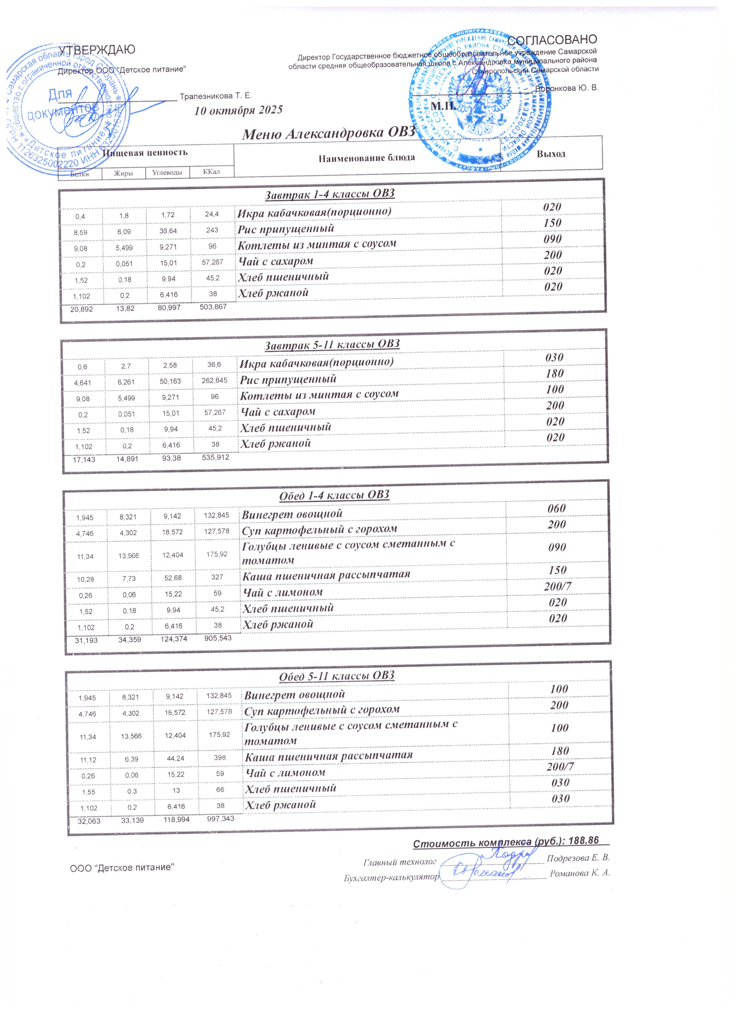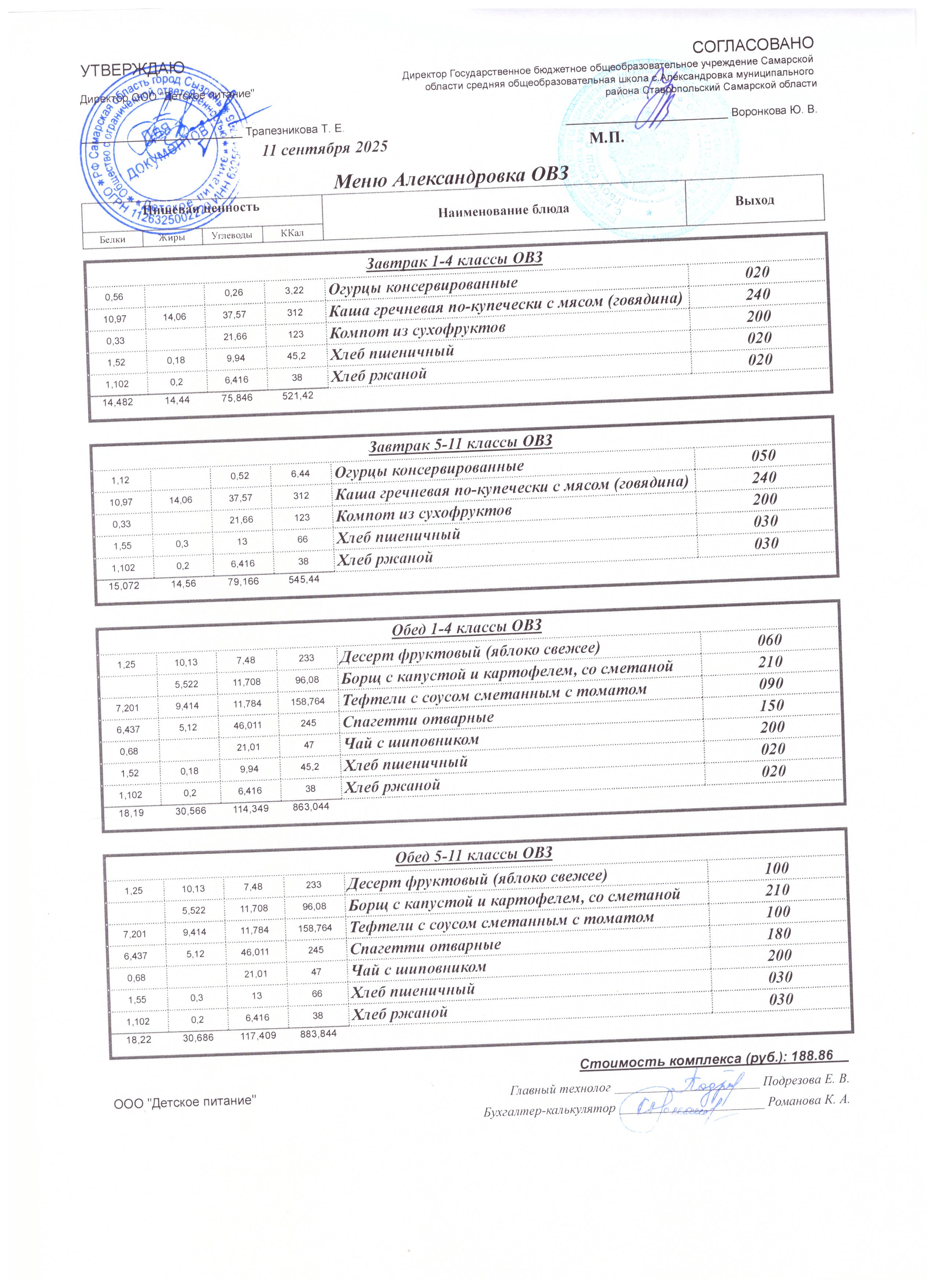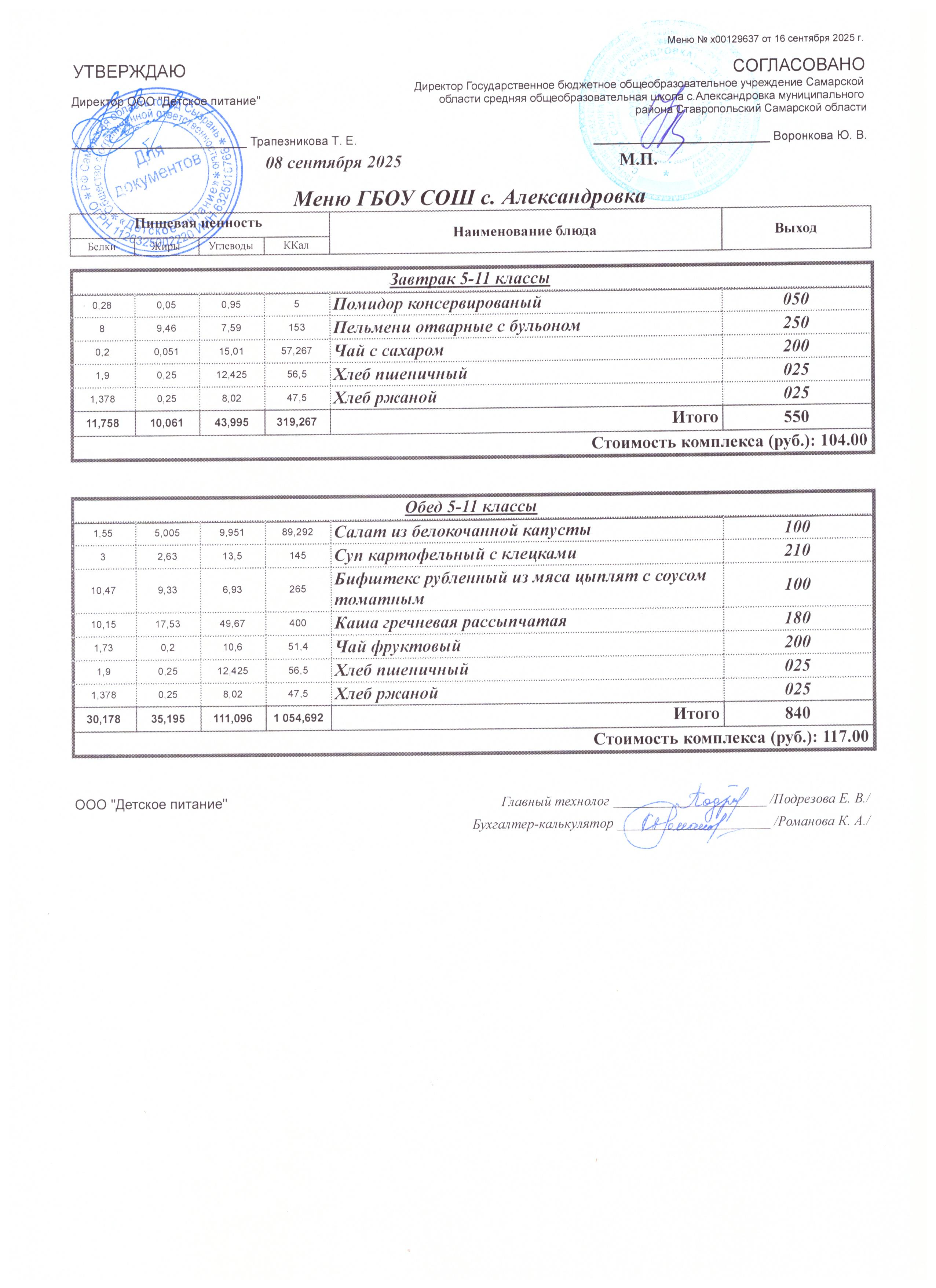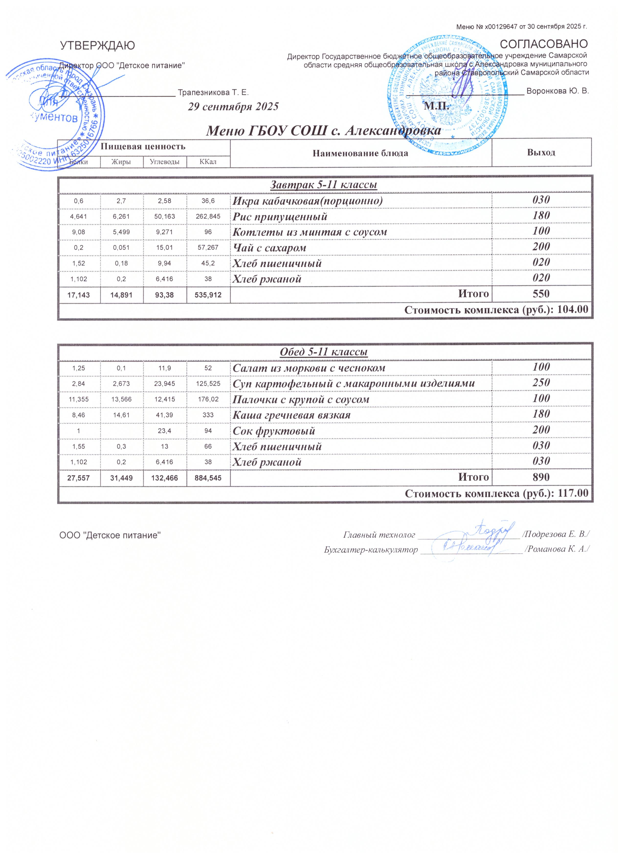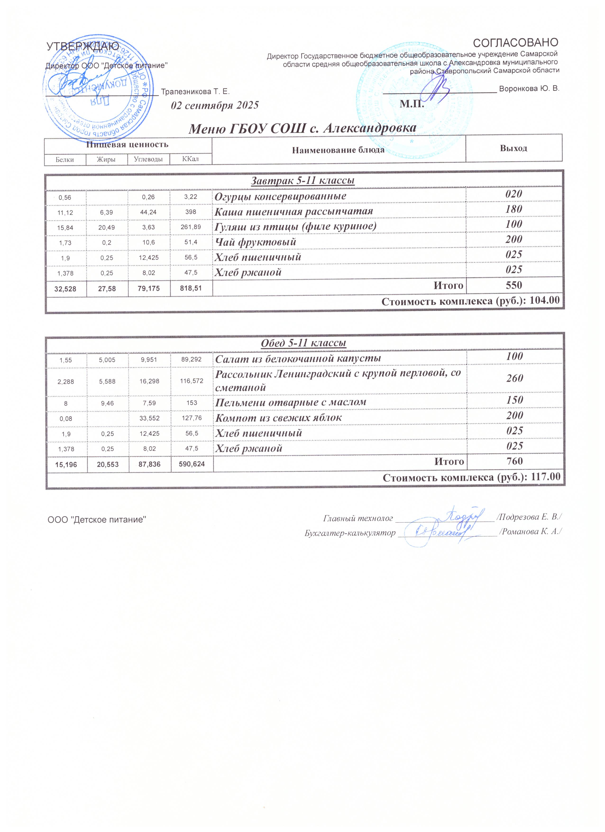 Ответственный за питание в ГБОУ СОШ с. Александровка Земляк Елена Павловна 8(8482)238150