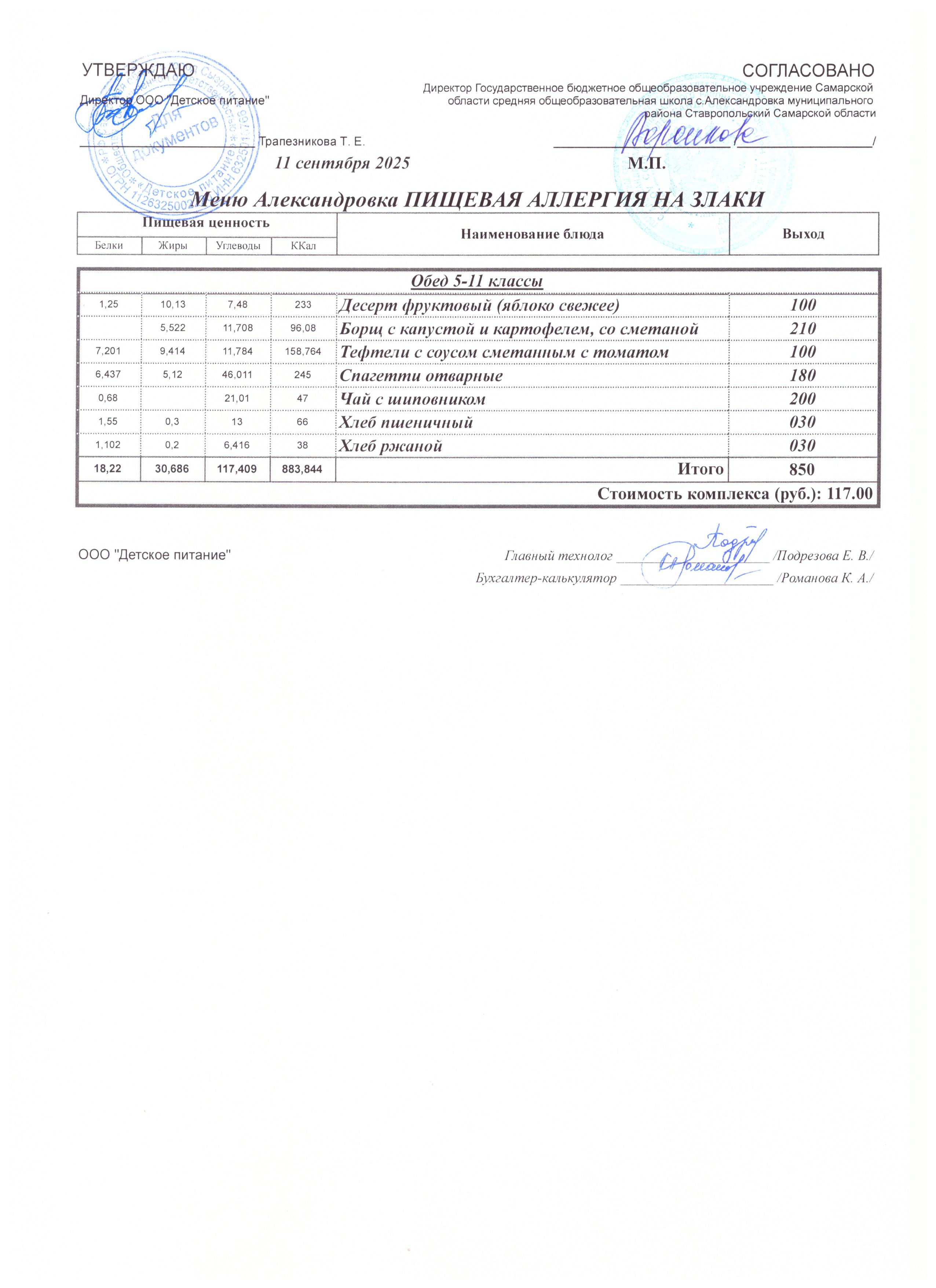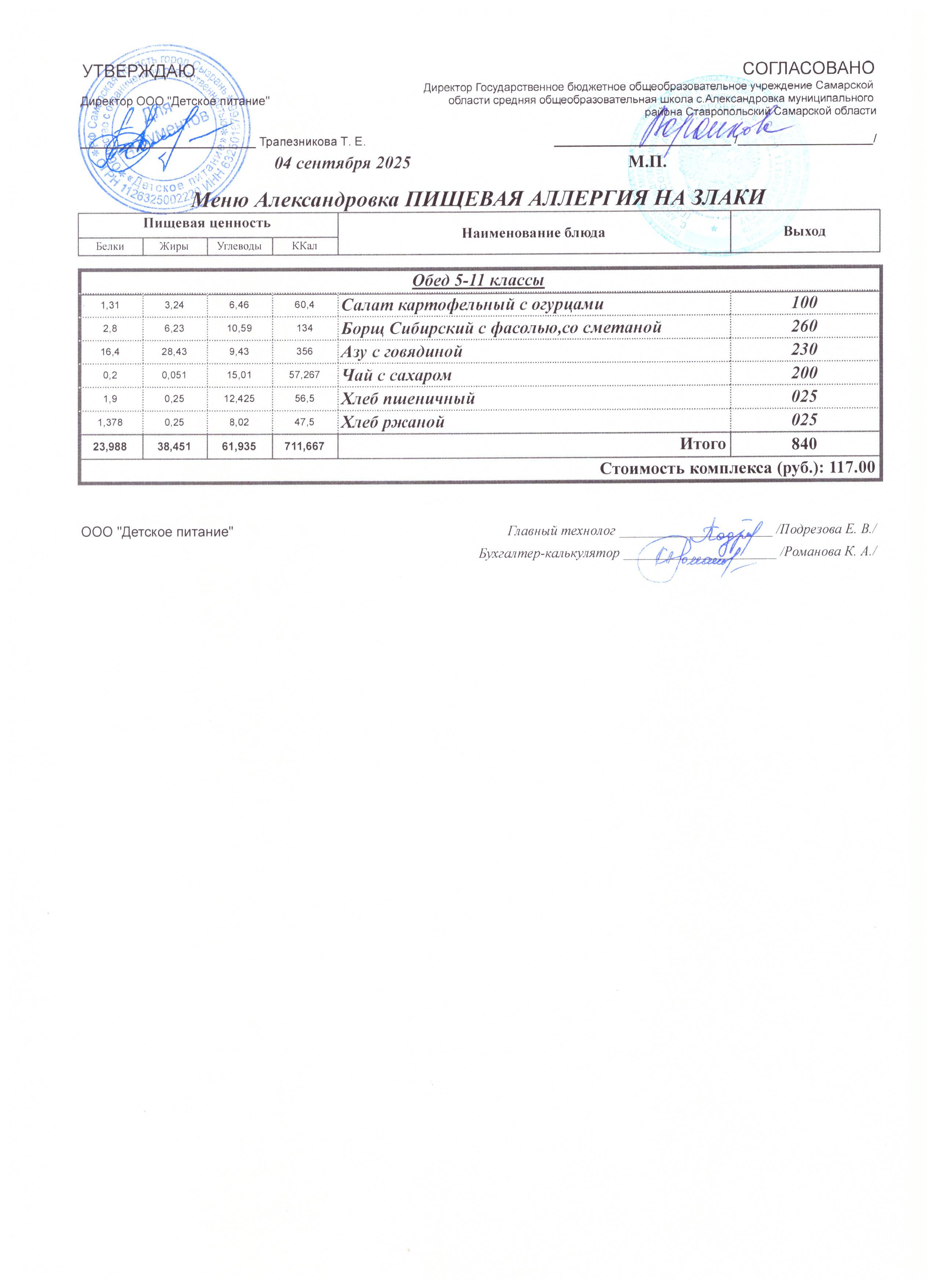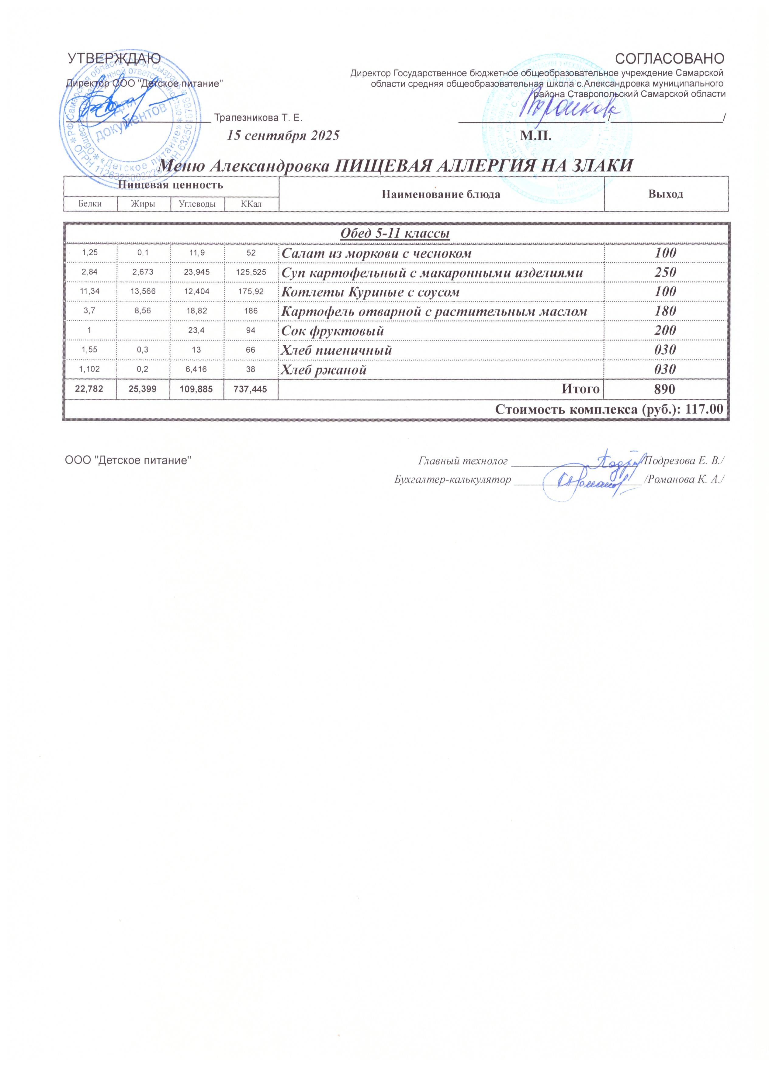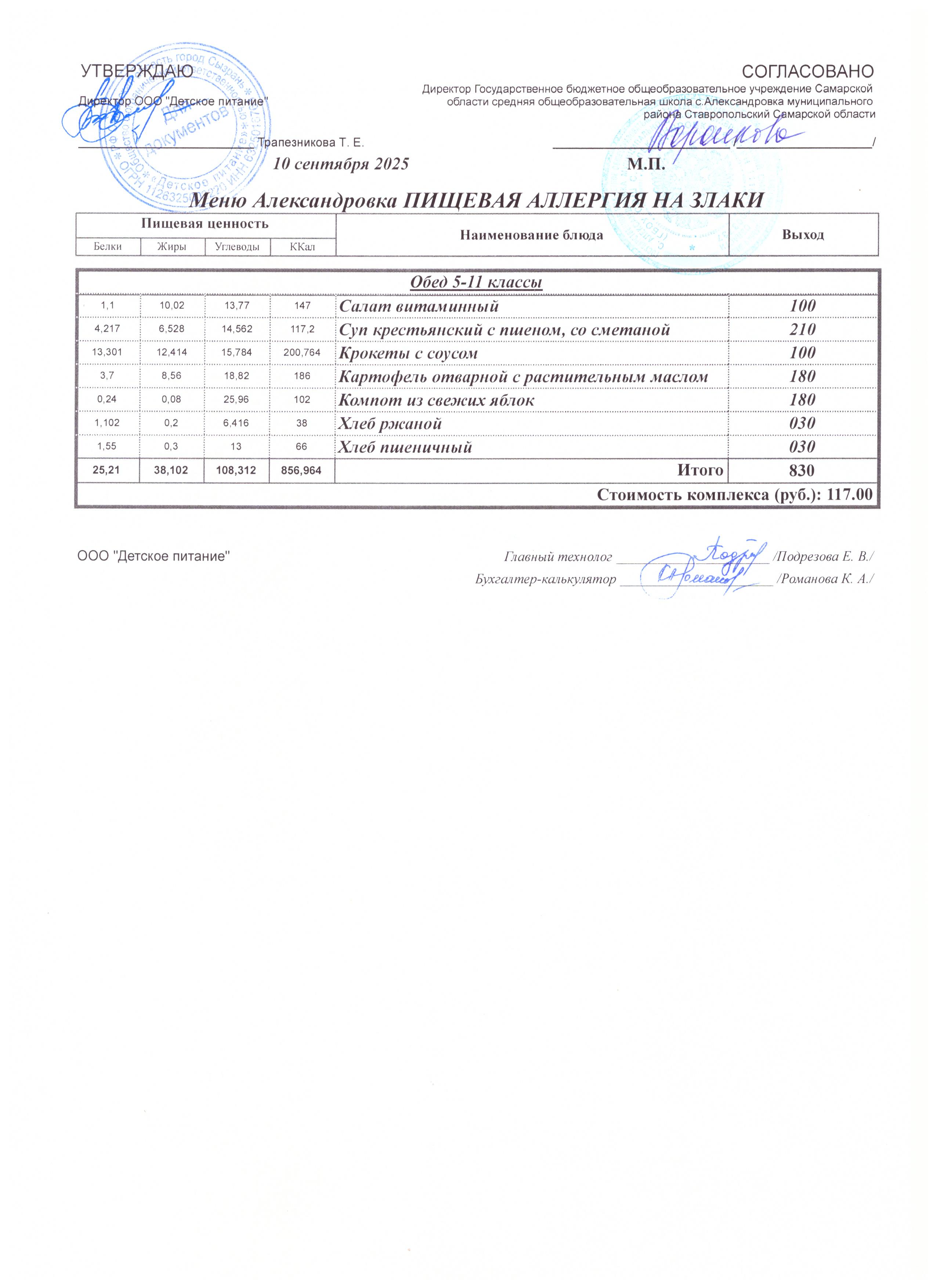 Ежедневное общее меню для учащихся с пищевой аллергией на злаковые: