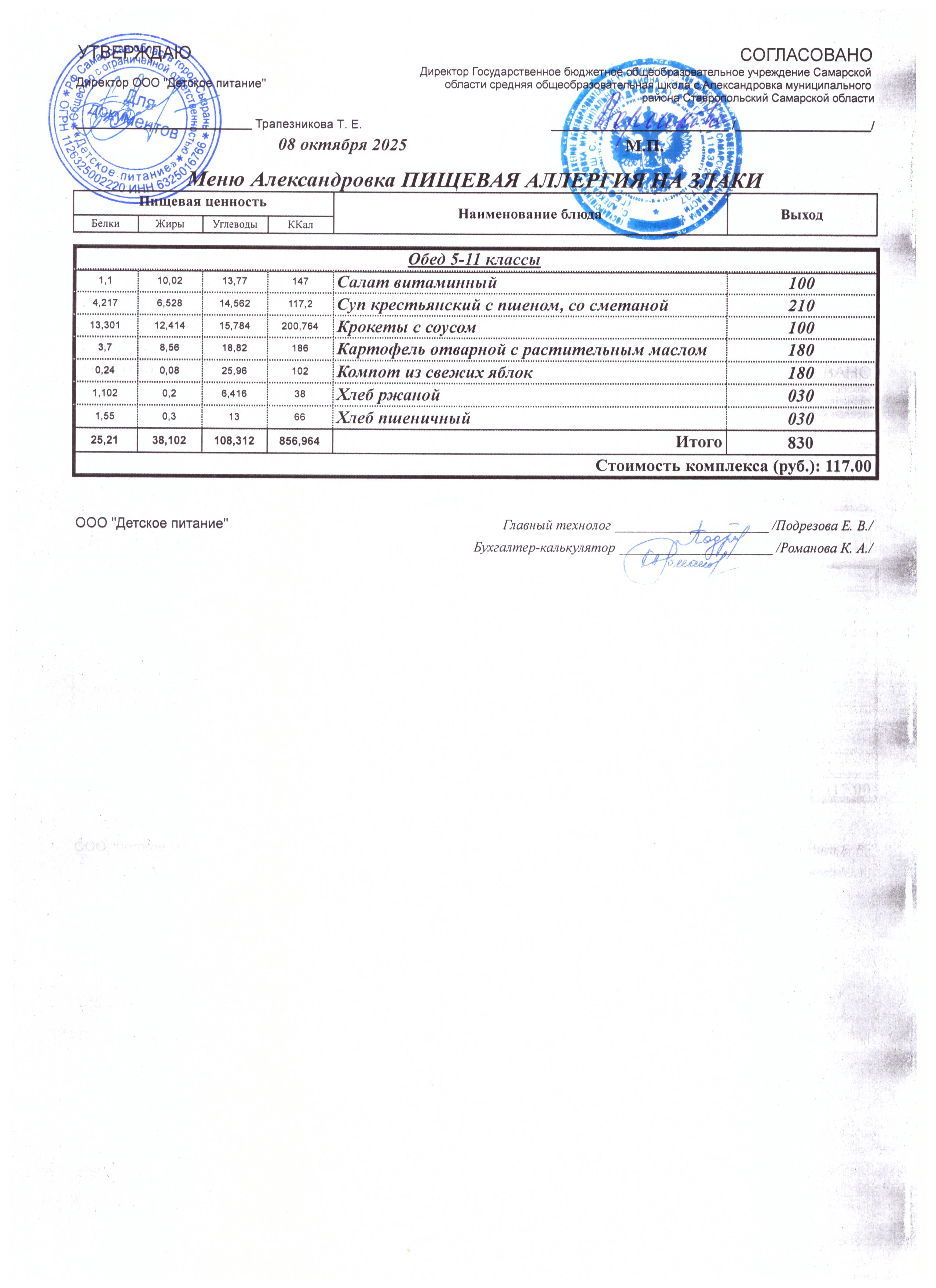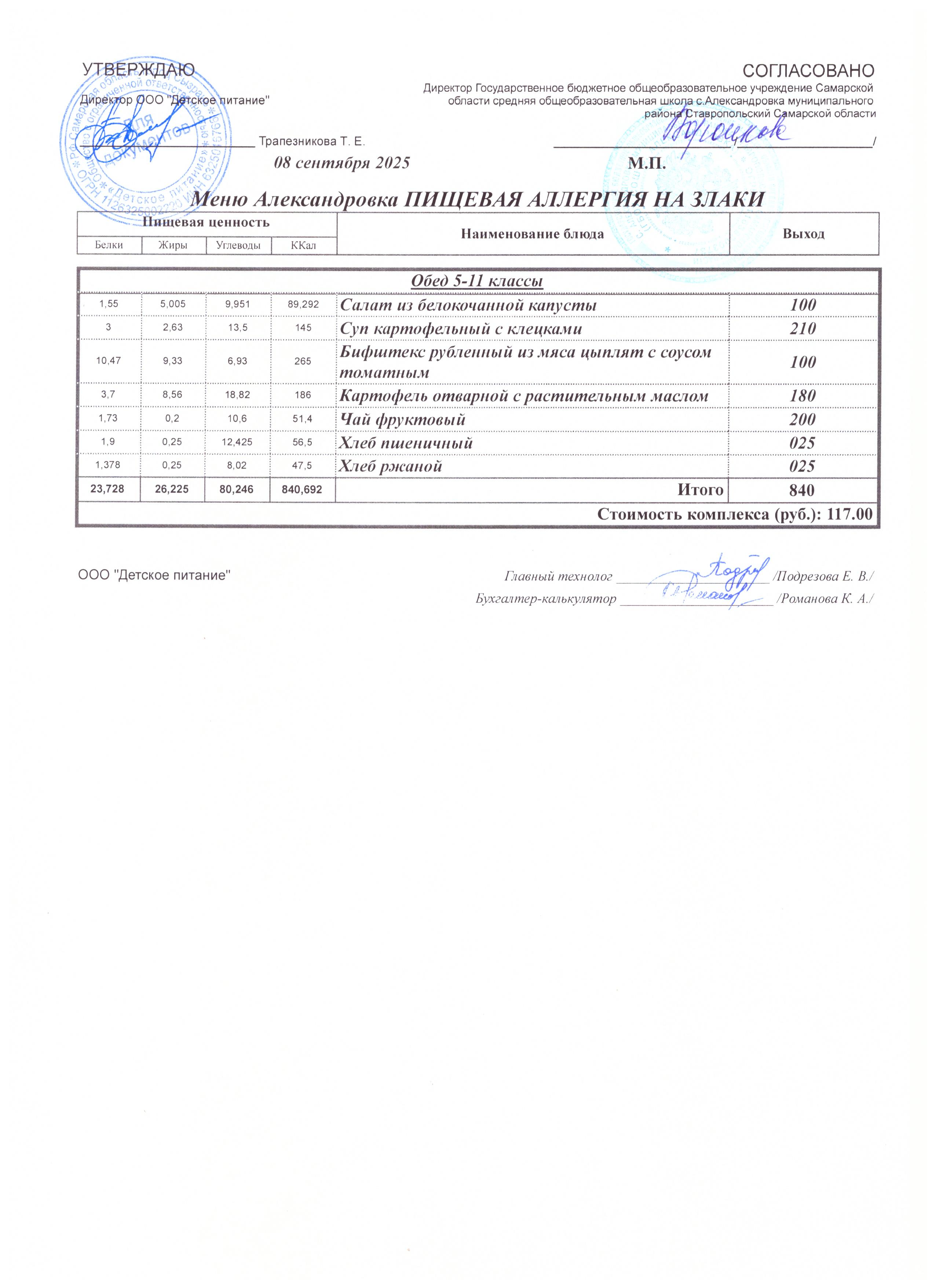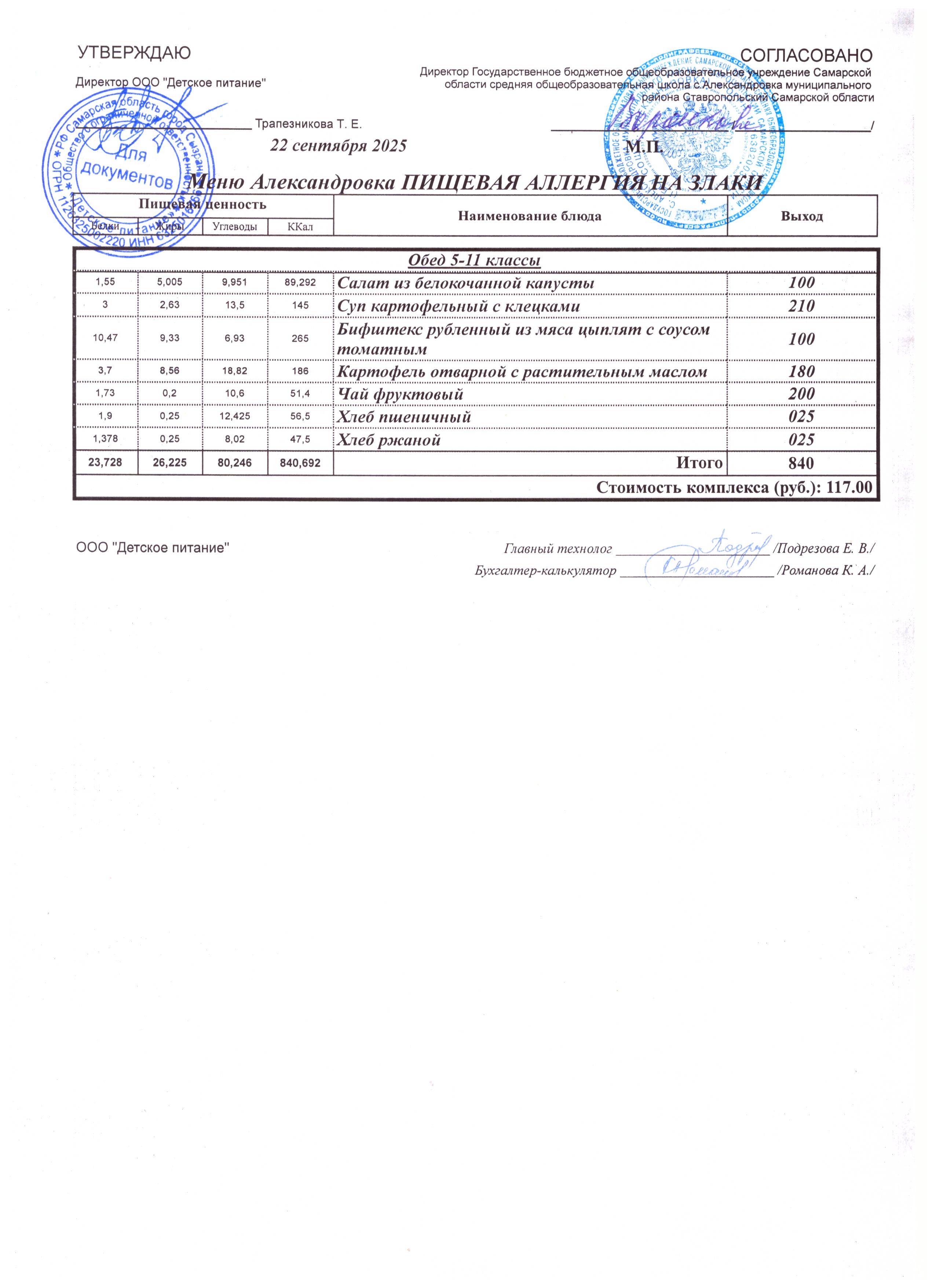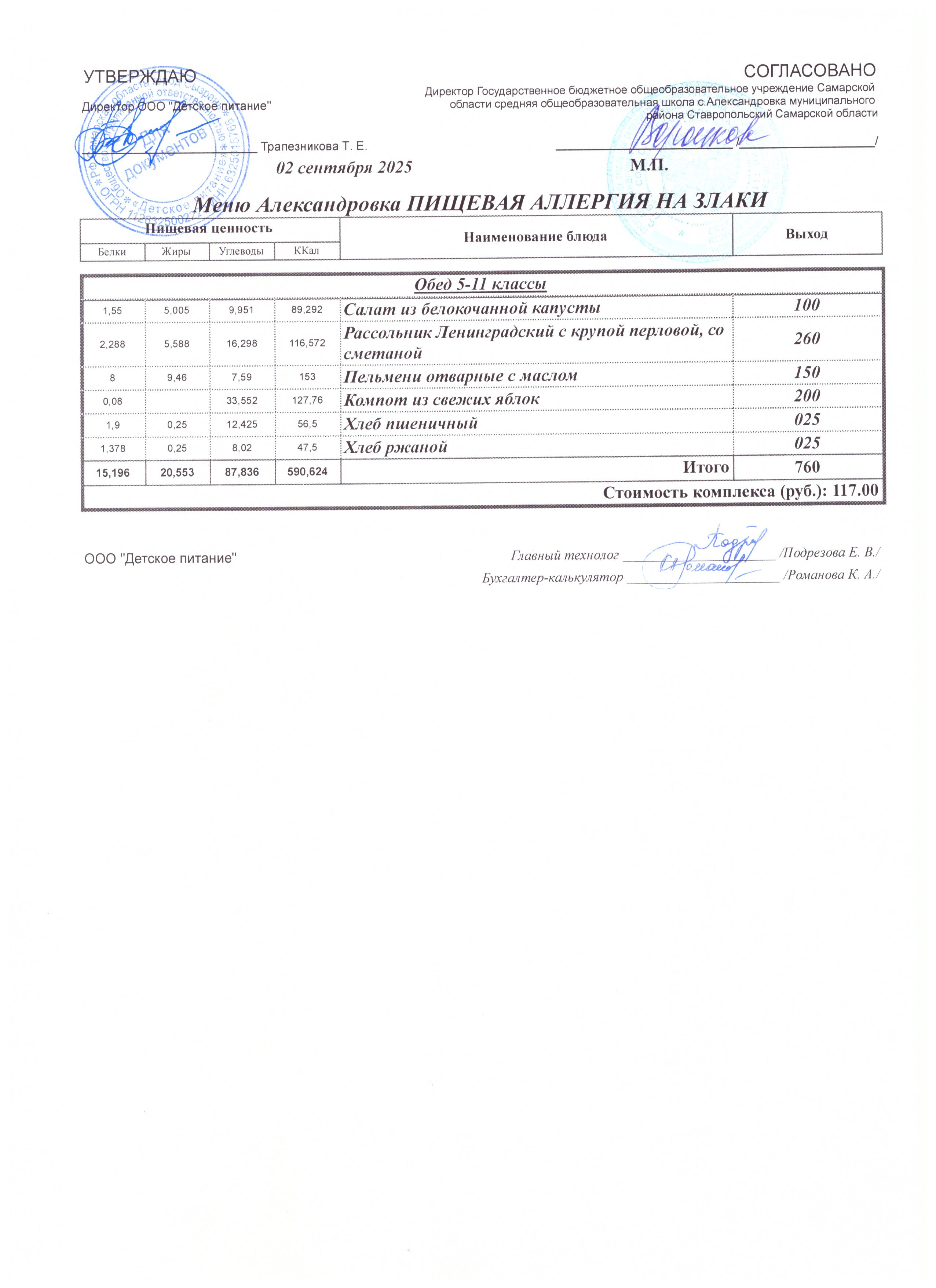 Ежедневное общее меню для учащихся с пищевой аллергией на злаковые: