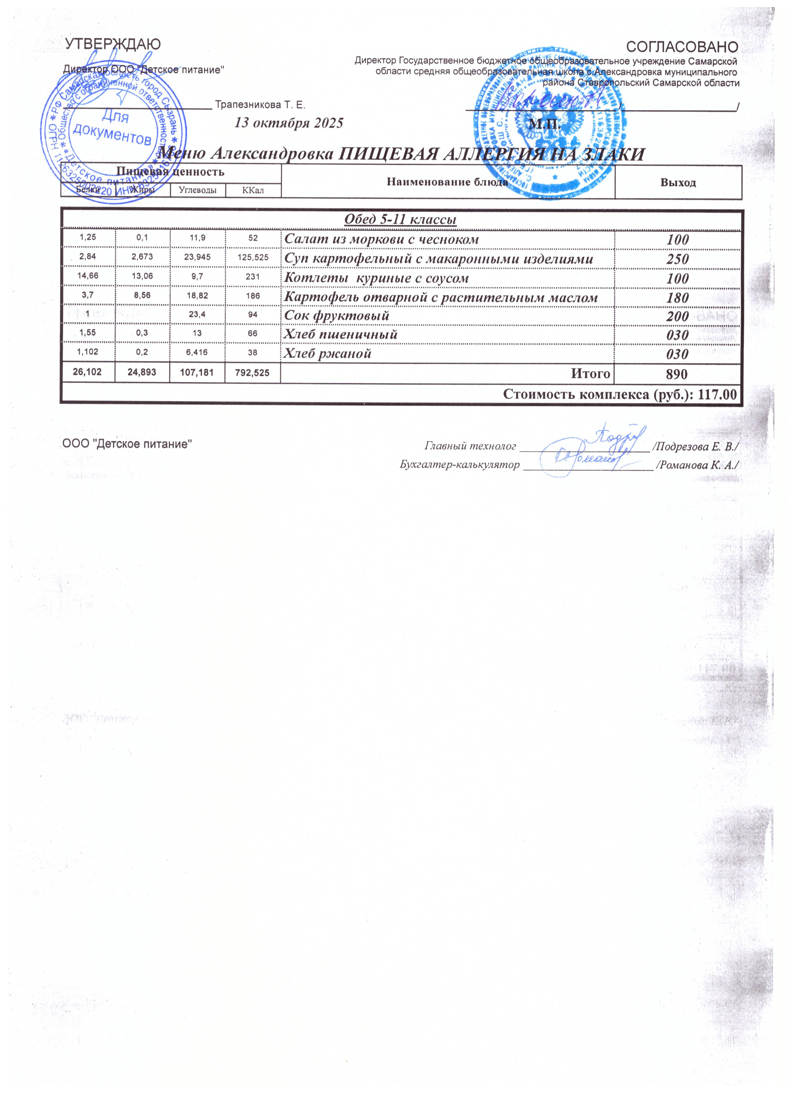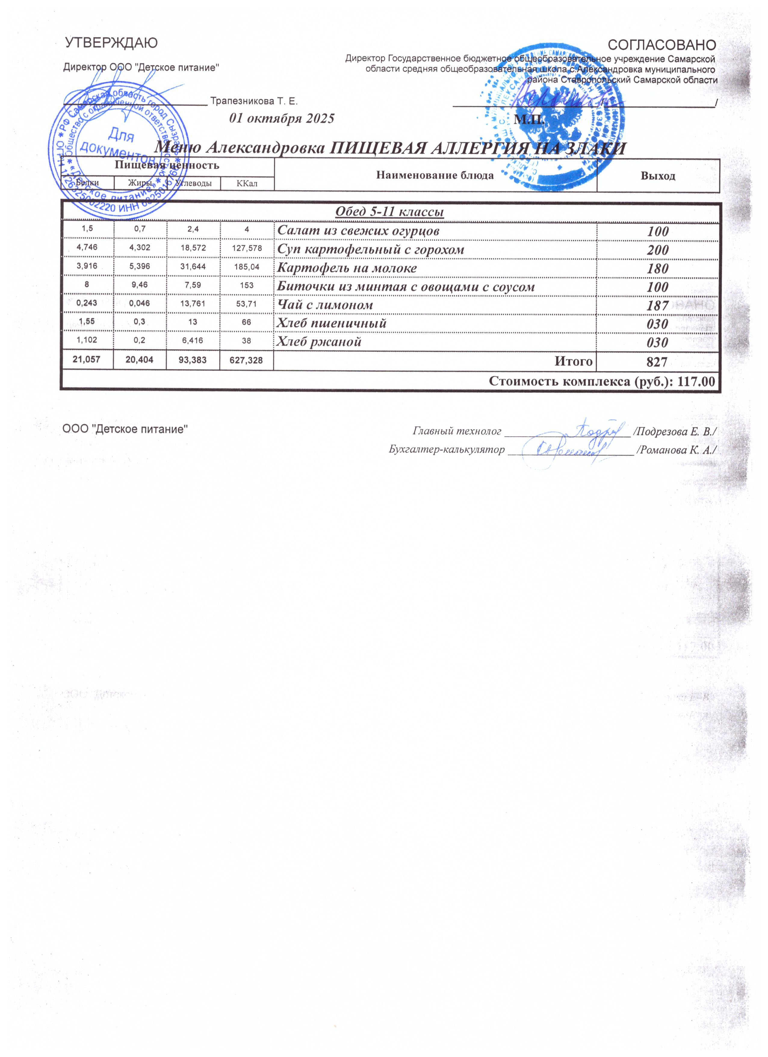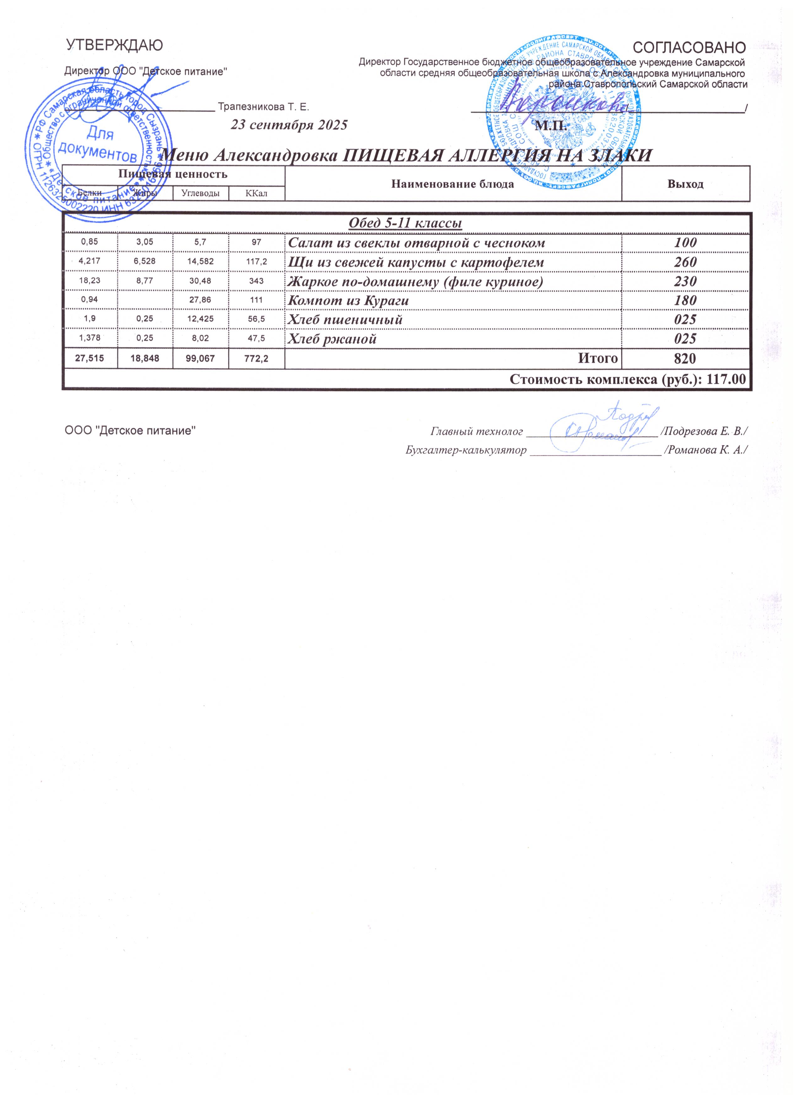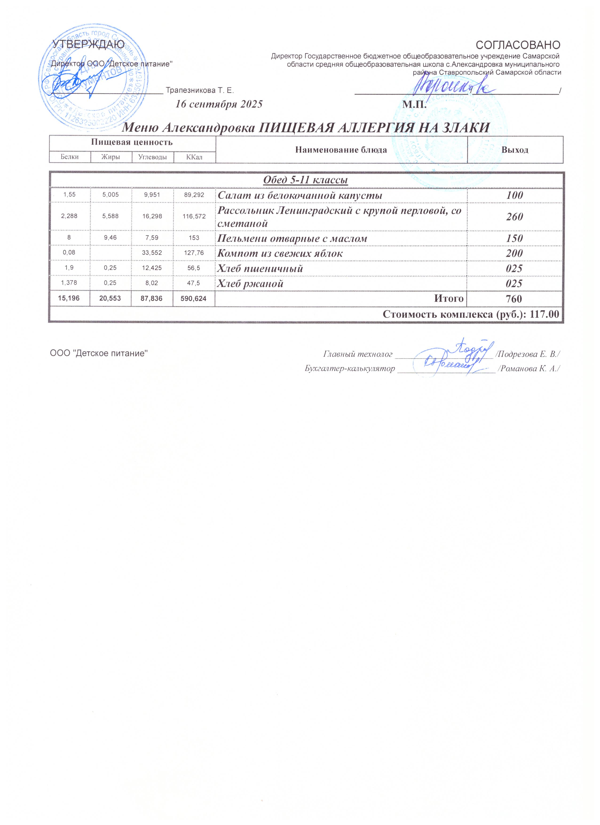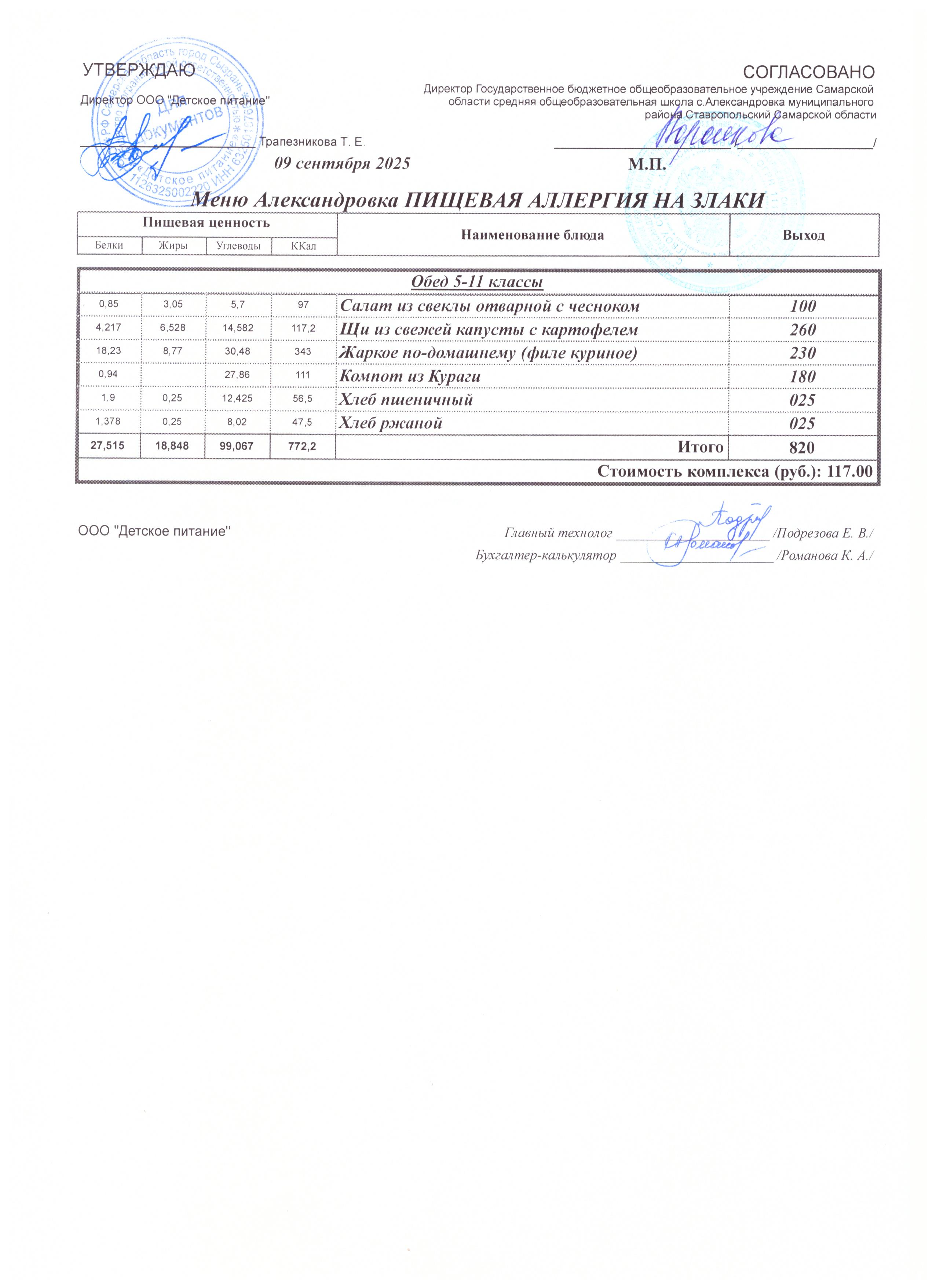 Ежедневное общее меню для учащихся с пищевой аллергией на злаковые: