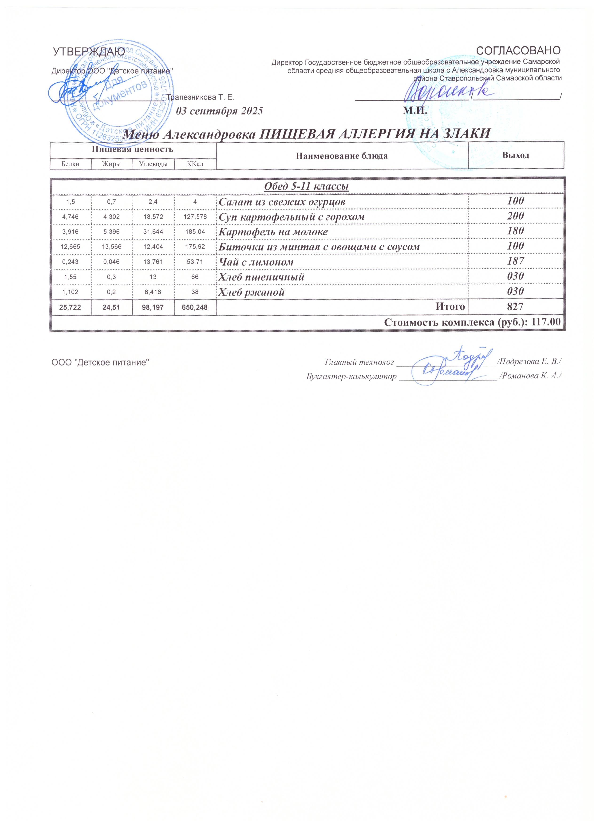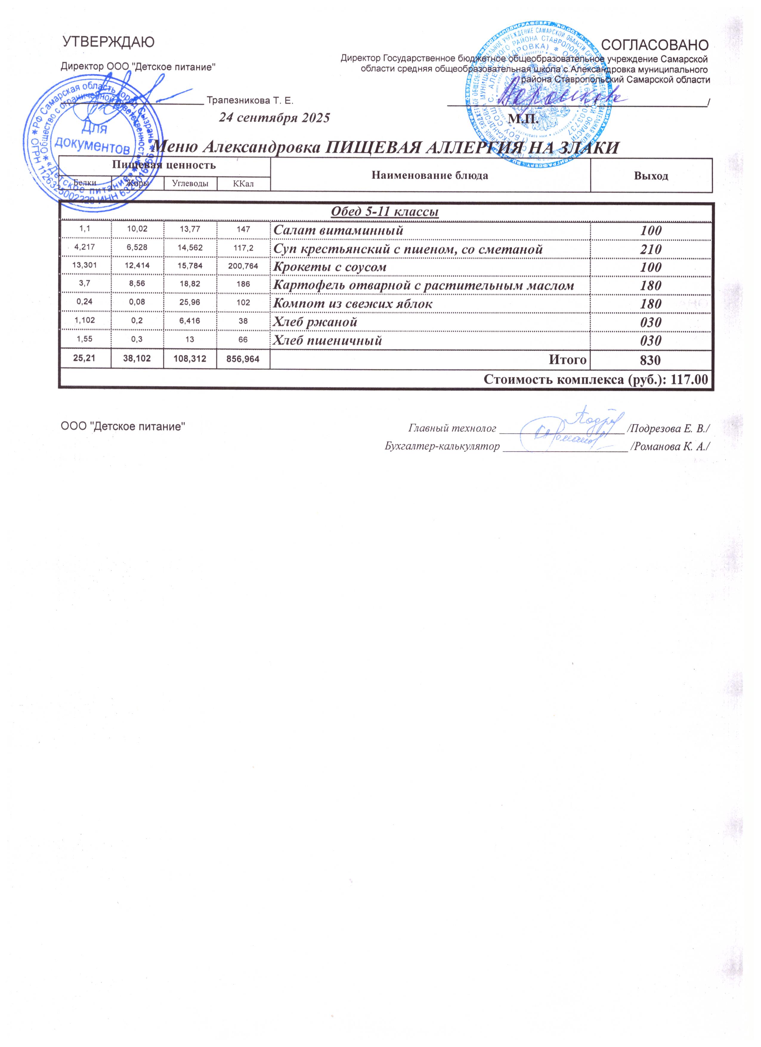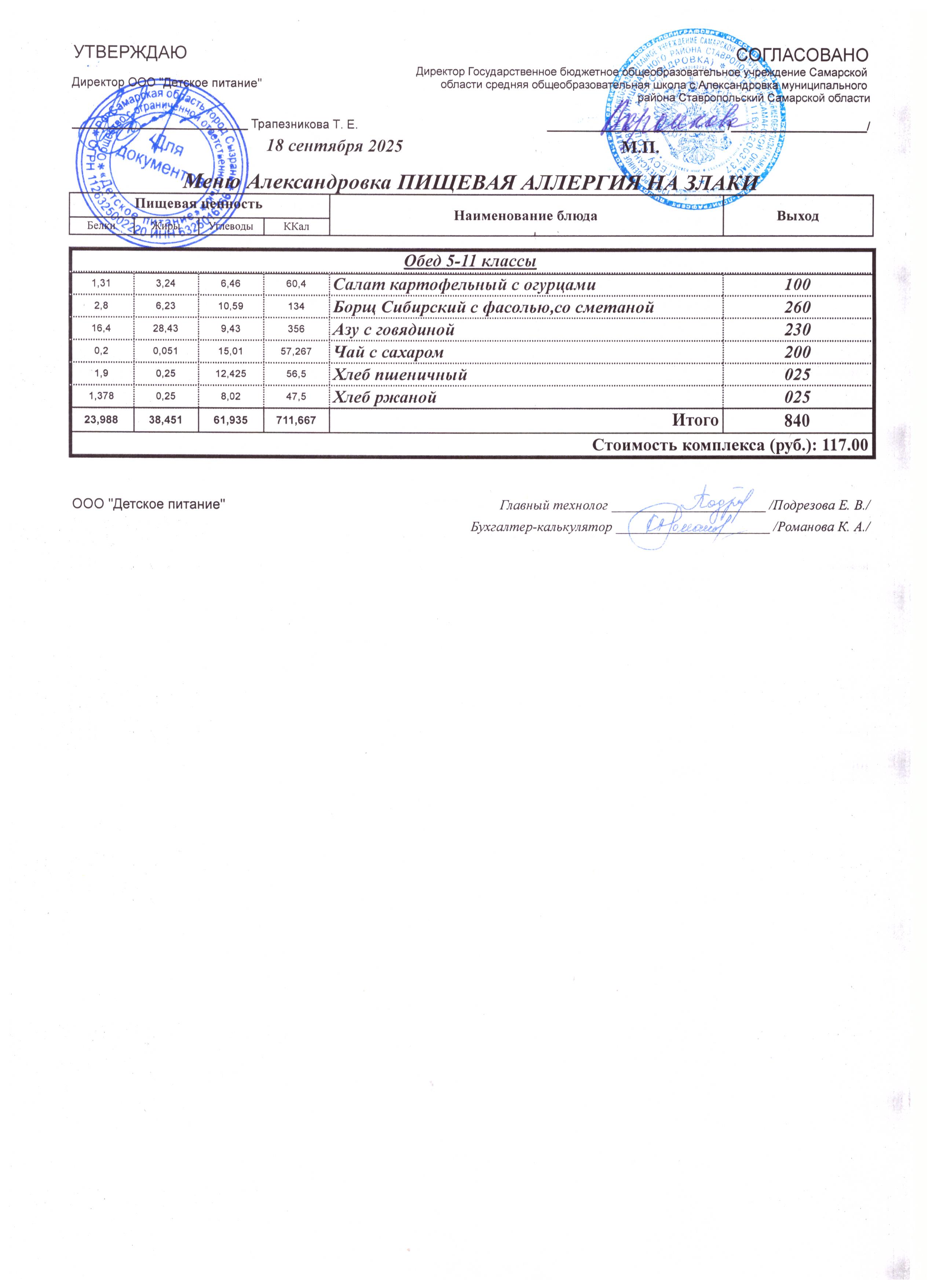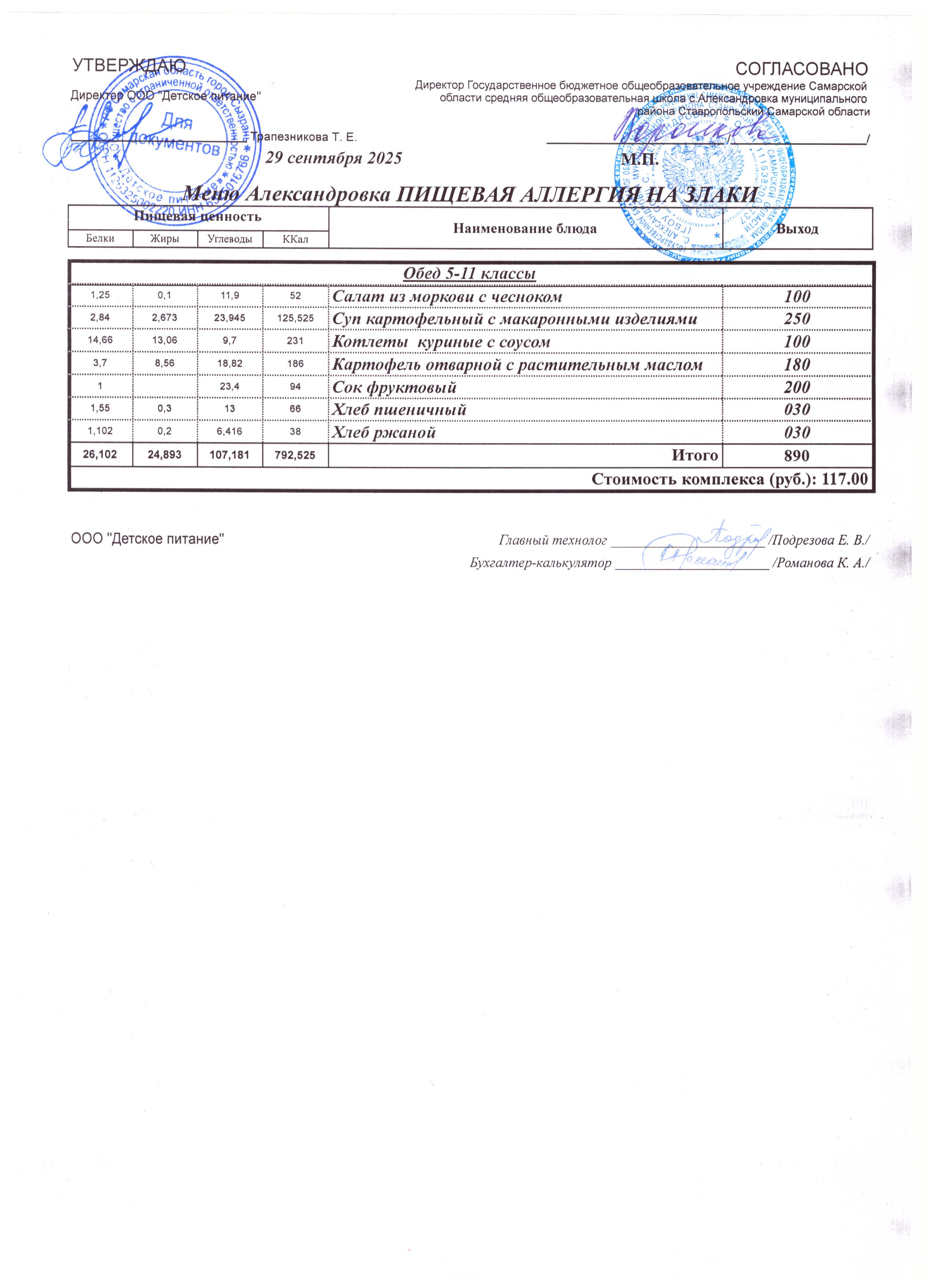 Ежедневное общее меню для учащихся с пищевой аллергией на злаковые:
